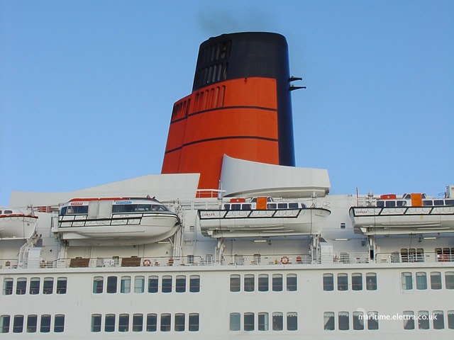 - 1 The QE2 has one funnel, measuring 69 ft/21 m in height, and painted in Cunard's traditional colours